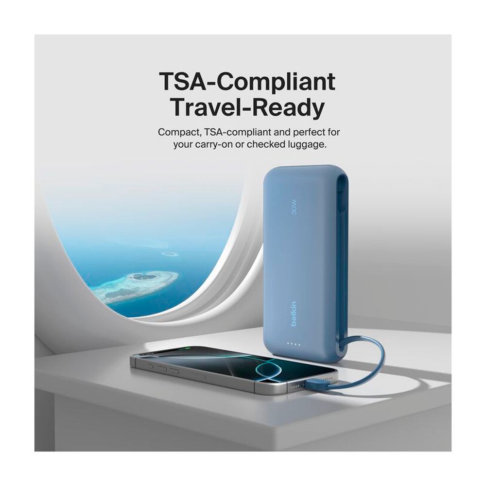 Con un cable USB-C integrado, un puerto USB-A y un puerto USB-C, puedes cargar tres dispositivos simultáneamente con una salida compartida de 30 W. Asegúrate de que tu smartphone y tablet tengan energía dondequiera que estés.