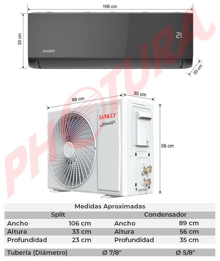 Medidas Aproximadas del split (Ancho x Alto x Profundidad): 106cm x 33cm x 23cm