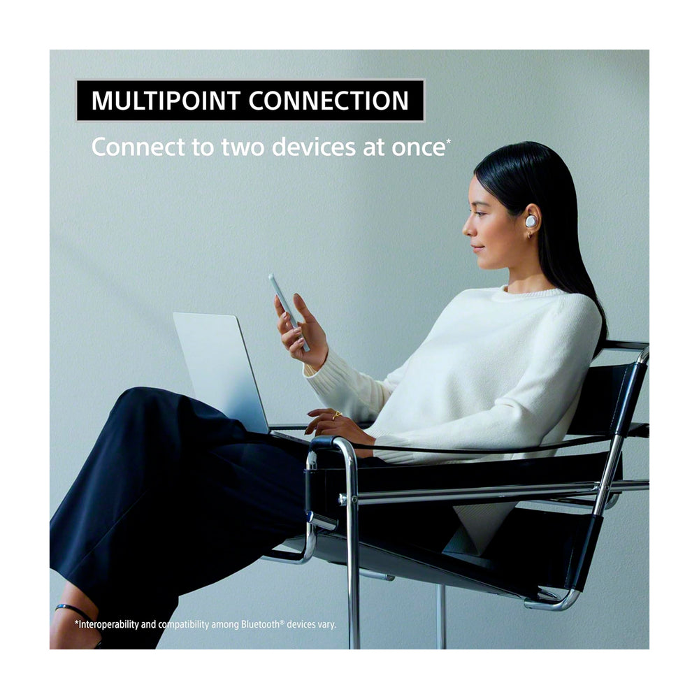 La conexión multipunto permite emparejar los auriculares WF-C710N con dos dispositivos Bluetooth® simultáneamente. Por lo tanto, si estás escuchando música en un dispositivo, y una llamada entra en otro, tu música se pausa automáticamente y la llamada se activa desde el otro dispositivo. Tu música se reanuda automáticamente una vez que finaliza la llamada.
