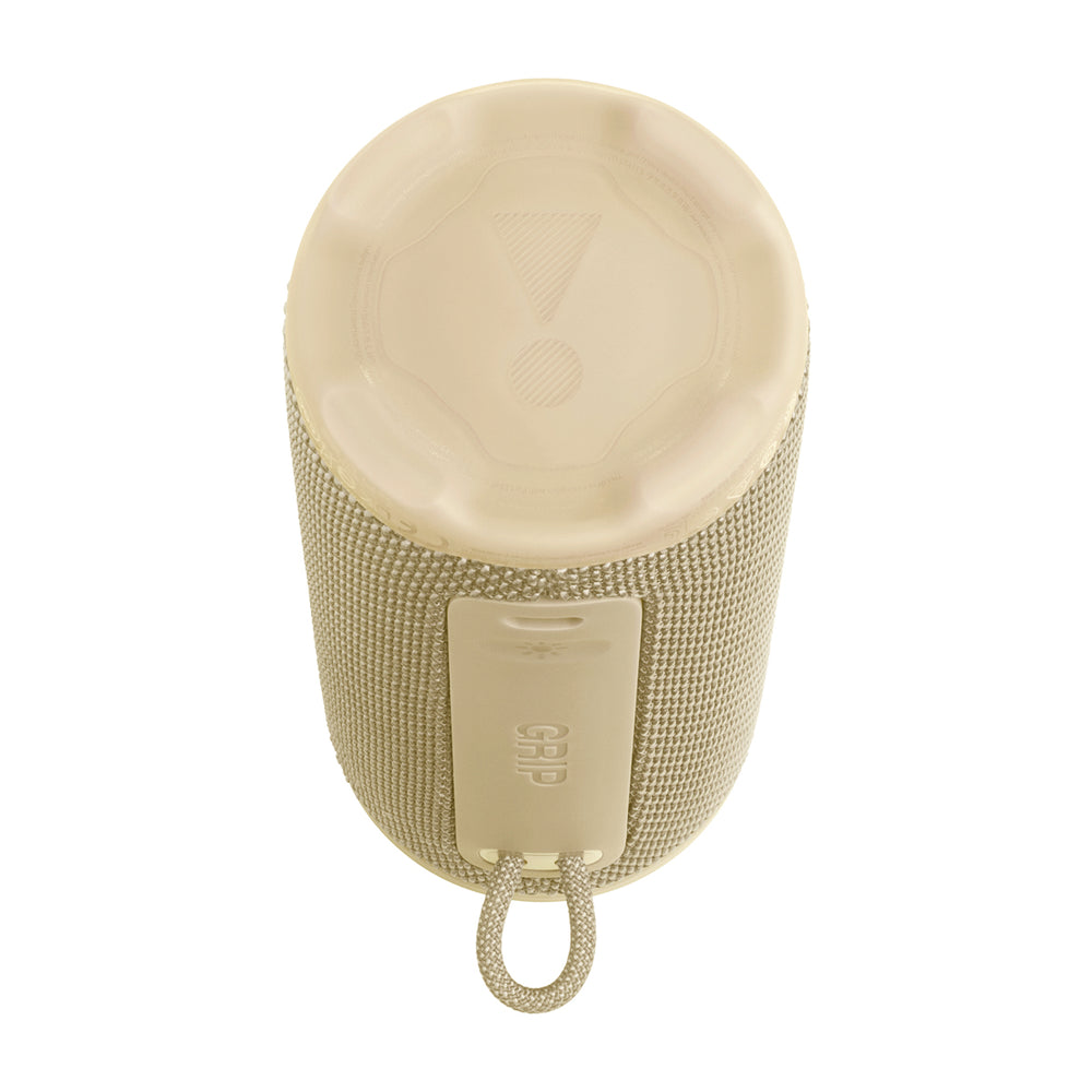 El JBL Grip puede ser lo suficientemente pequeño como para sostenerlo con una mano, pero ofrece un potente sonido JBL Pro. AI Sound Boost analiza la música en tiempo real y utiliza un algoritmo para optimizar el sonido, logrando más potencia y menos distorsión.