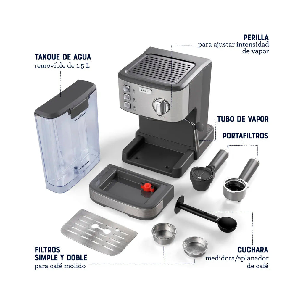 La cafetera compacta de espresso Oster® tiene un elegante diseño con acabados de acero inoxidable y su tamaño compacto la hace un complemento elegante para cualquier cocina. Es compatible con cápsulas de Dolce Gusto® y posee un tubo de vapor cuya intensidad puede ser ajustada con una perilla, lo cual te permitirá crear leche espumosa para preparar deliciosos cappuccinos, lattes y más. Tiene una bomba italiana de 15 bar de presión para preparar un deliciosos espresso y puede preparar hasta dos espressos por ciclo. Posee un tanque de agua de 1.5L extraíble que permite llenarlo fácilmente y una fácil limpieza, además incluye portafiltros para café molido de 1 y 2 tazas y una cuchara medidora/aplanador de café.