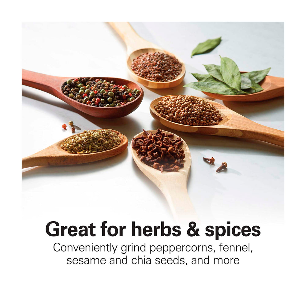 Es fácil e intuitivo de usar, tanto si eres nuevo moliendo café en grano como si llevas años moliendo tus propios granos. Solo tienes que colocar la tapa y pulsar el botón para moler el café; suéltalo para detener la molienda. Con sus resistentes cuchillas de acero inoxidable, este molinillo muele café y tus hierbas y especias favoritas de forma eficiente. Es ideal para moler pimienta, hinojo y otras hierbas y especias para recetas o para tener a mano en la cocina. También puede moler semillas de sésamo, lino, chía y otras para batidos, batidos de proteínas o para añadir a tus comidas. El compartimento oculto para el cable en la parte inferior del molinillo lo guarda de forma ordenada y oculta cuando no se usa.