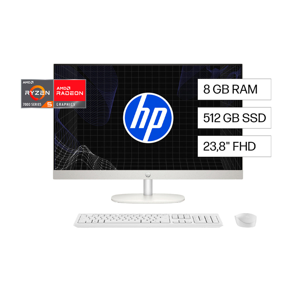 HP Computadora de Escritorio All in One de 23.8" FHD, AMD Ryzen 5 7520U, 8GB RAM, 512GB SSD, AMD Radeon, Windows 11 Home | Blanco