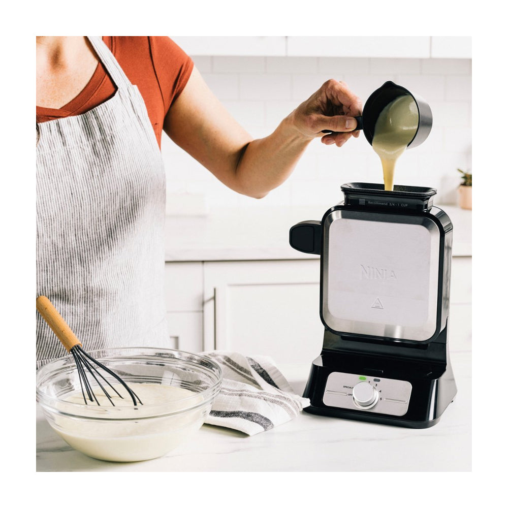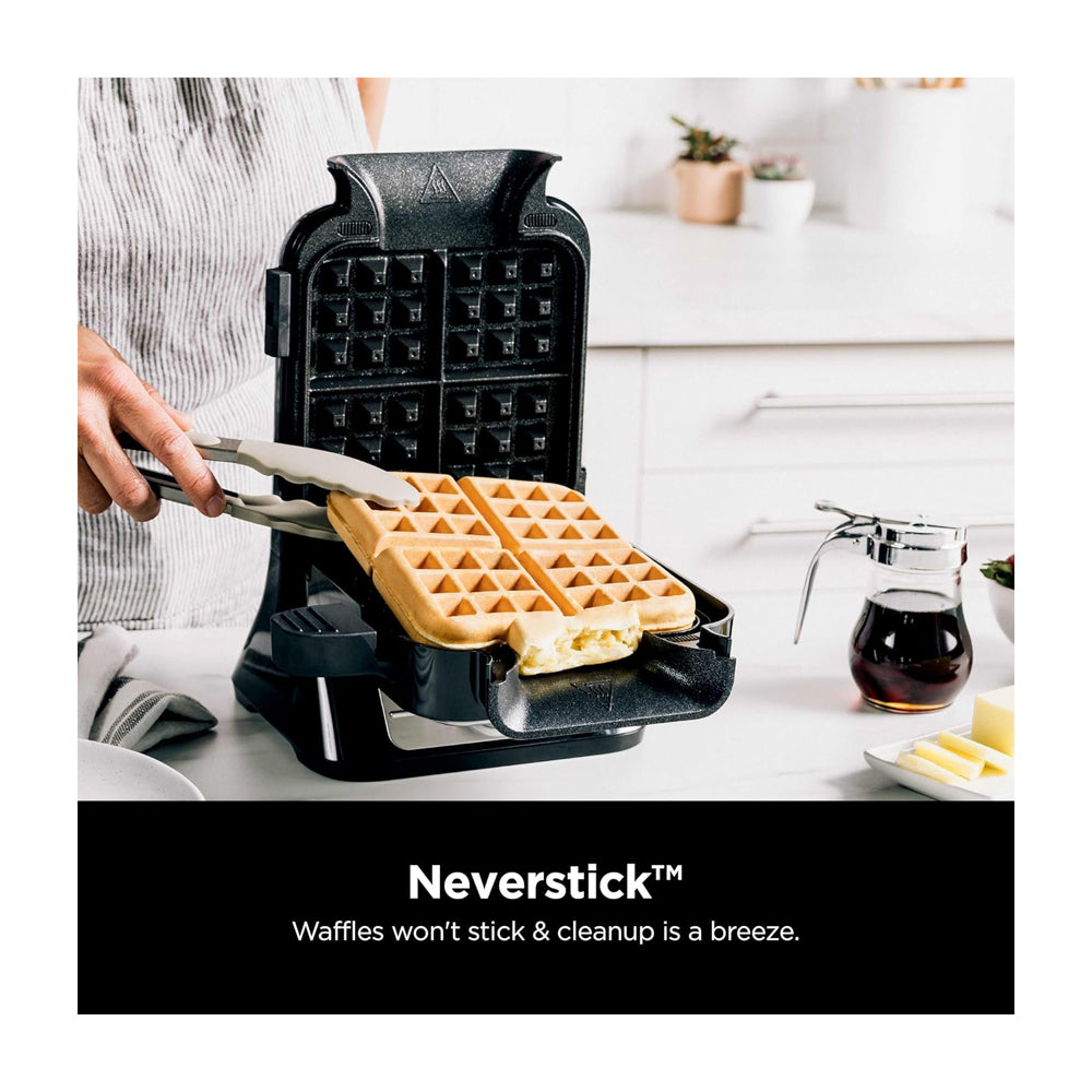 Conozca la máquina para hacer waffles belgas Ninja PRO Neverstick. No se pega nada, nunca. Los waffles no se pegan y la limpieza es muy sencilla. Su exclusivo diseño vertical ofrece calor de borde a borde que crea waffles esponjosos de manera uniforme con un acabado crujiente.