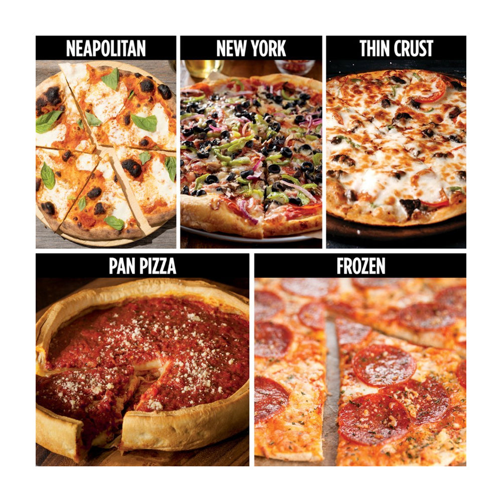 Pizzas sin necesidad de dar vuelta en 3 minutos y sin complicaciones*. Elija entre 5 configuraciones diferentes para satisfacer cualquier antojo: napolitana, masa fina, sartén, estilo Nueva York y congelada. *Cocinadas a 700 °F, no incluye precalentamiento.