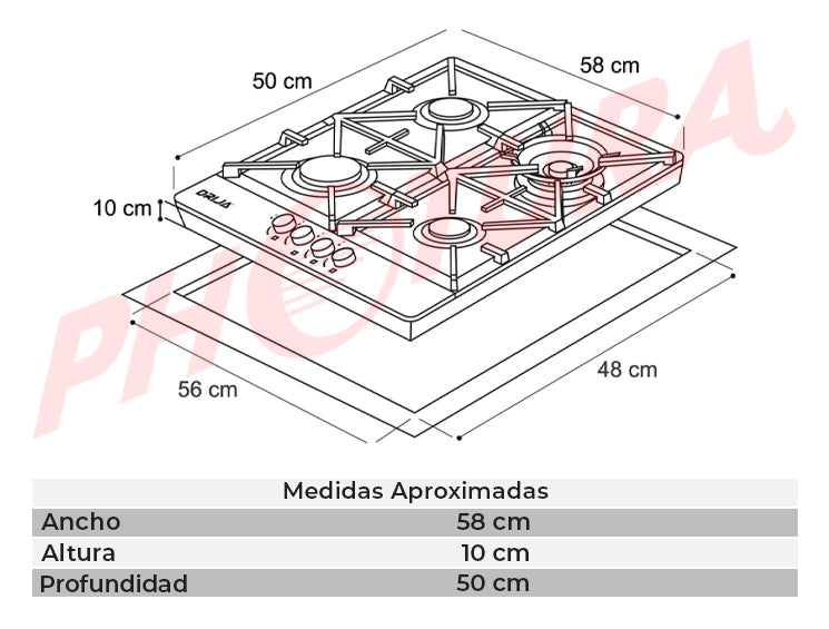 Drija Milan 60 Pro Estufa Empotrable a Gas de Acero Inoxidable | 4 Quemadores | 4 Válvulas de Seguridad