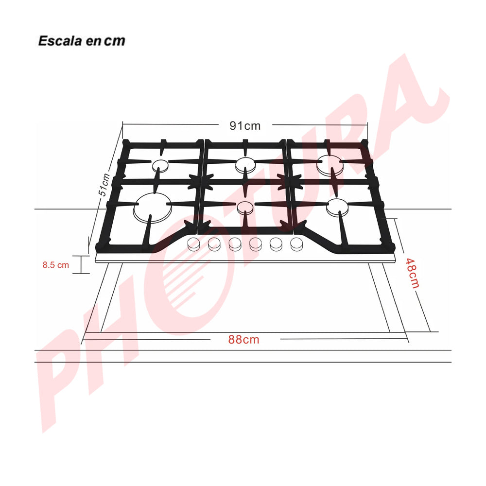 Drija Milan 91 Estufa Empotrable a Gas de Acero Inoxidable | 6 Quemadores | 6 Válvulas de Seguridad
