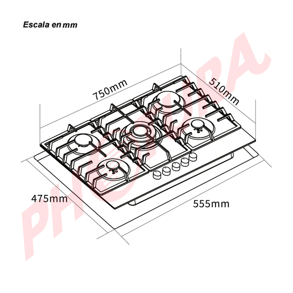 Sankey Estufa Empotrable a Gas de Vidrio Templado | 75cm | 5 Quemadores | Encendido por Pulso