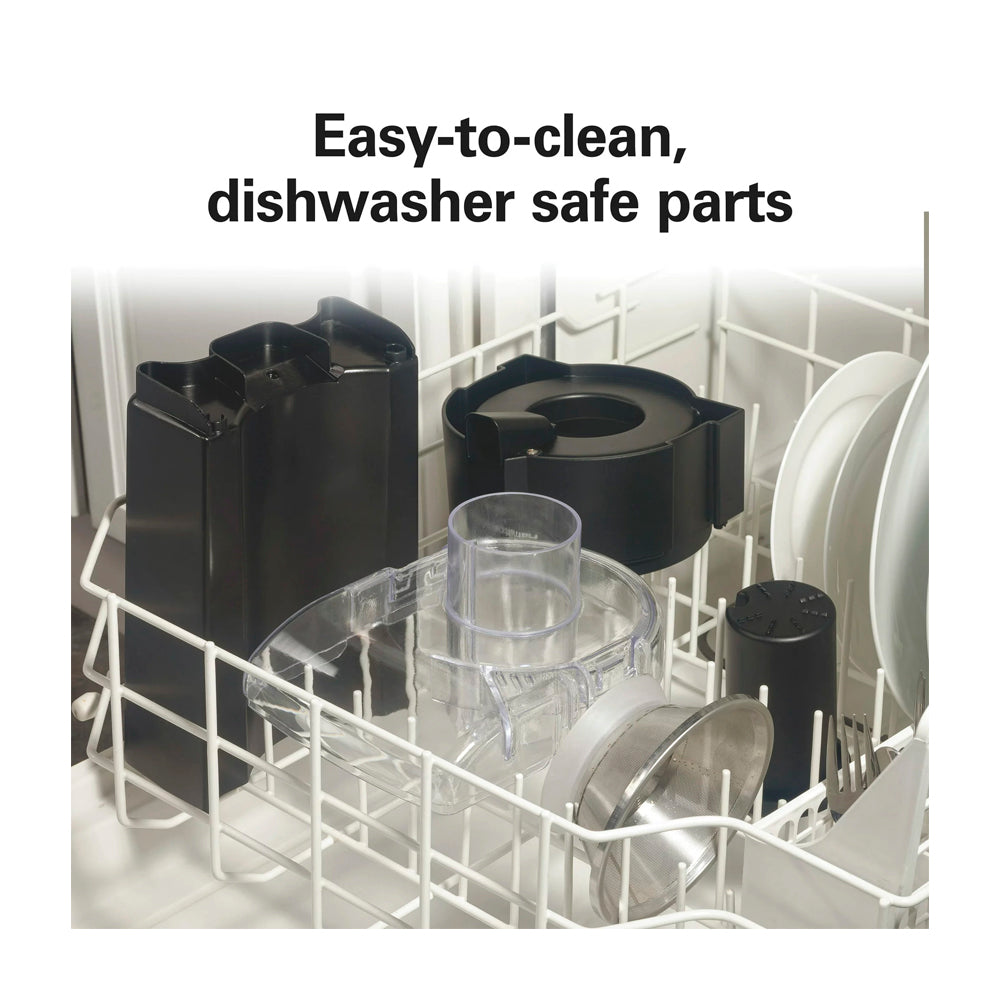 Mientras exprimes el jugo, el duradero filtro de acero inoxidable elimina la pulpa y las semillas para obtener resultados suaves. Cuando haya terminado de exprimir, todas las piezas extraíbles se colocan en el lavavajillas para una fácil limpieza. Libre de BPA en zonas alimentarias. Respaldado con una garantía limitada de 3 años de Hamilton Beach, la marca número uno en extractores de jugo.*