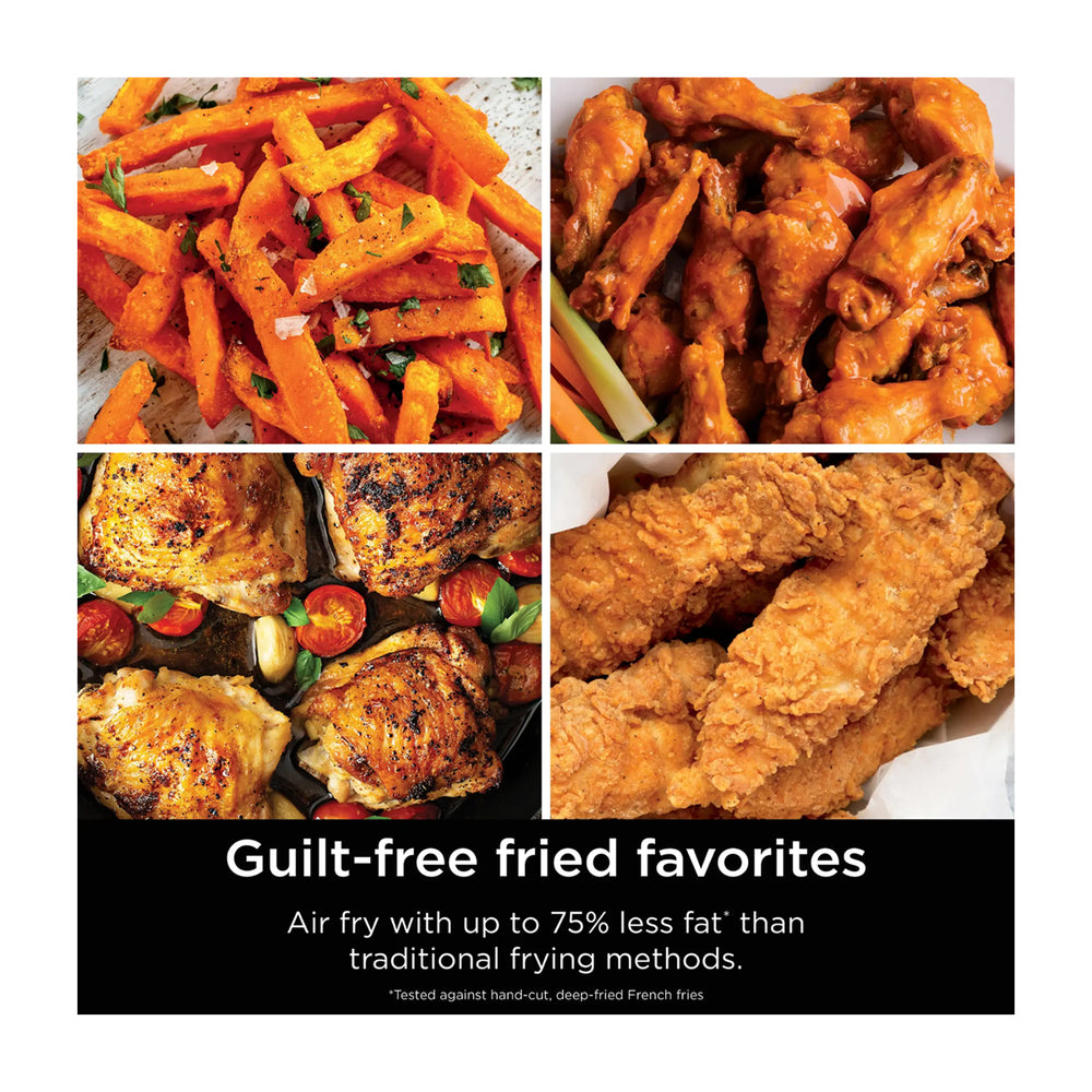 El diseño apilado de Ninja te permite cocinar el doble de comida en casi la mitad de espacio y cabe debajo de gabinetes estándar. Además, es un 40 % más delgada que las freidoras de aire tradicionales de dos cestas.