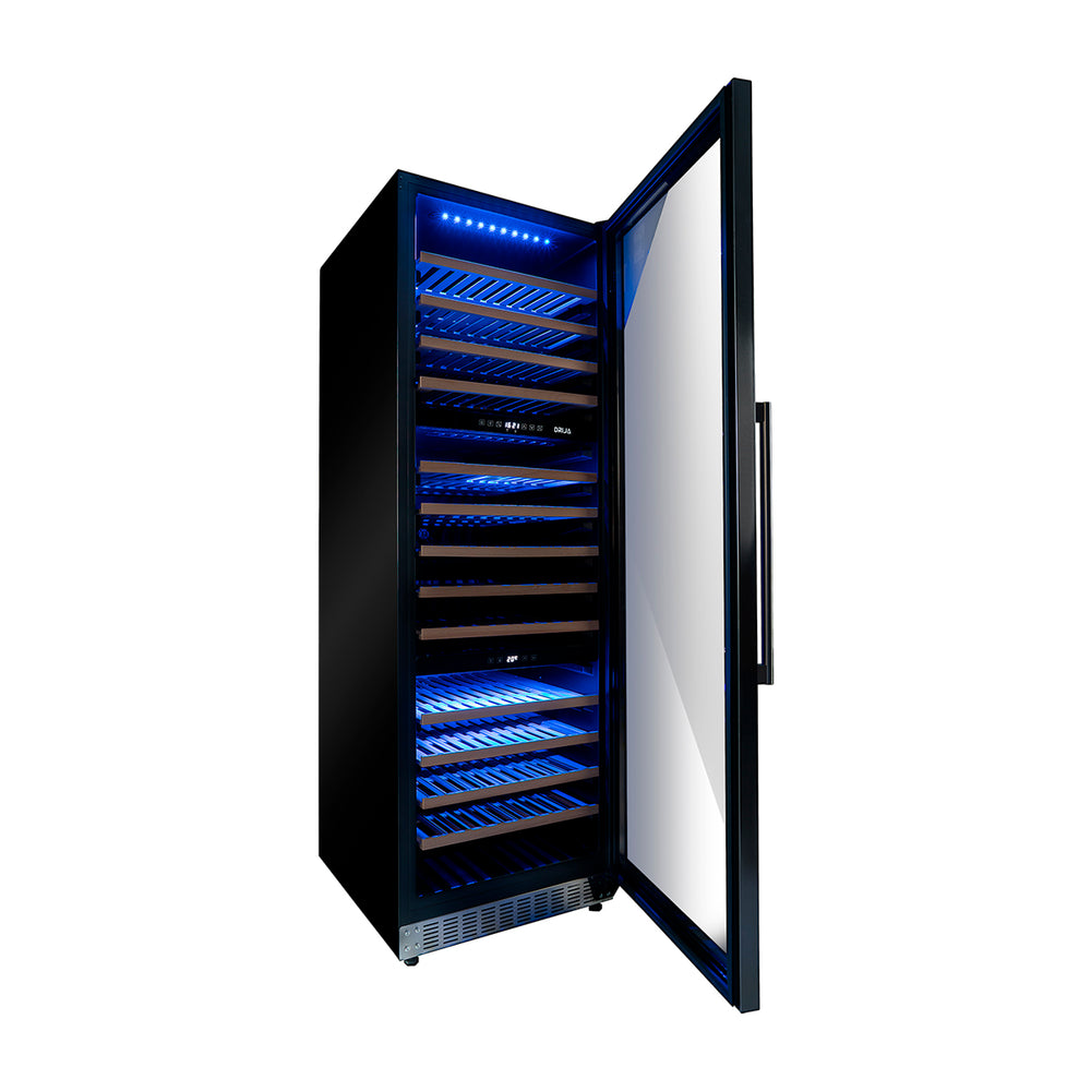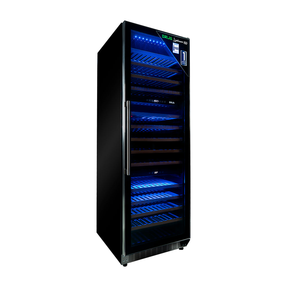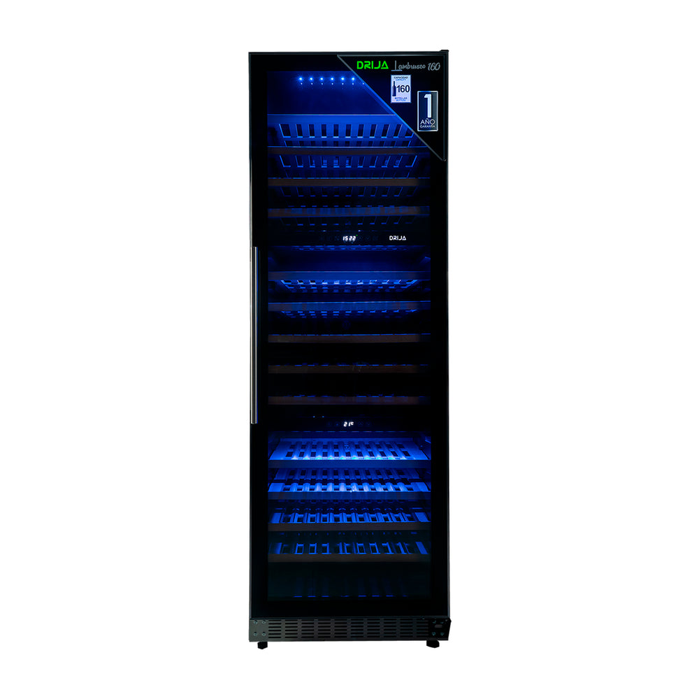 La vinera Lambrusco 160 de DRIJA está diseñada para verdaderos coleccionistas. Su capacidad de 160 botellas en 13 estantes de madera barnizada combina un diseño empotrable con sistema de enfriamiento triple que permite almacenar vinos tintos, blancos y espumosos con precisión. La iluminación LED azul, el panel táctil y su elegante puerta de acero con doble vidrio aportan estilo, eficiencia y funcionalidad para cualquier espacio gourmet o cocina moderna.