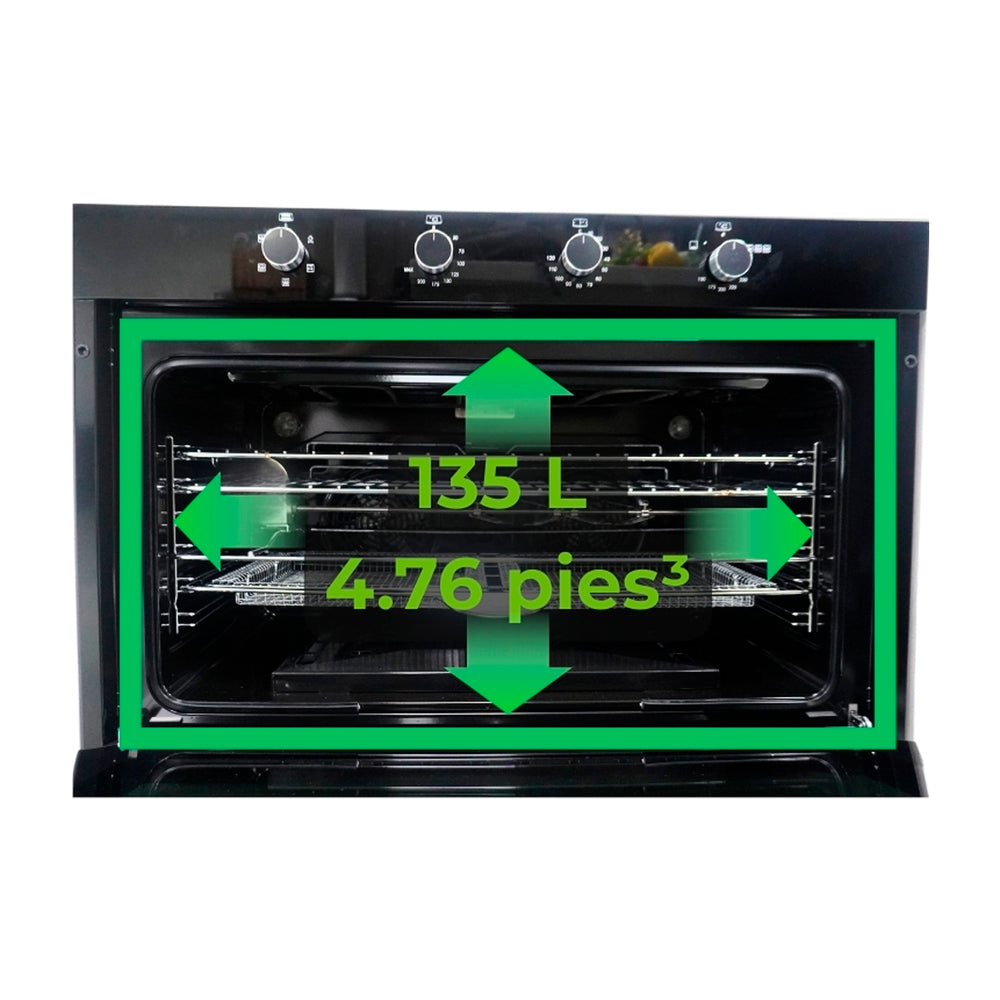 Con 135 L (4.8 pies³), este horno es ideal para familias grandes o cocinas profesionales que necesitan espacio sin restricciones.