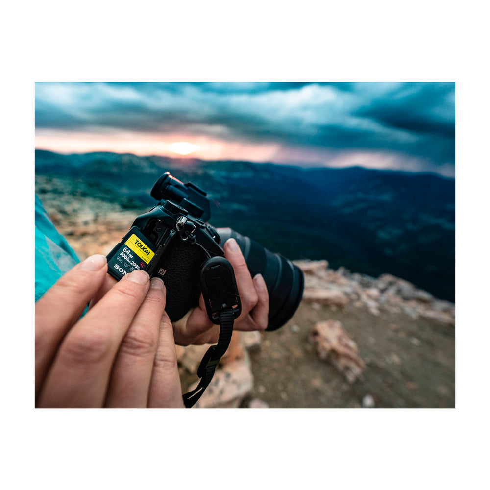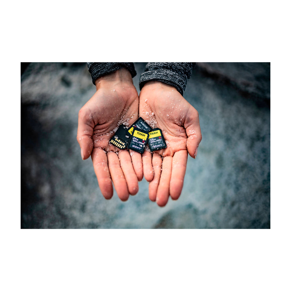 Para facilitar el uso de la tarjeta en prácticamente cualquier entorno y mantener tu contenido seguro, Sony ha creado la Serie TOUGH con un diseño robusto que soporta caídas de hasta 5 m (16,4'), inmersión en agua a 5 m (16,4') durante hasta 72 horas, y es resistente a la torsión, al polvo, a los rayos X, a los imanes y a la estática, además de a la luz UV y a temperaturas extremas de -13 a 185 °F. La Serie TOUGH también es hasta 18 veces más resistente que los soportes SD estándar (180 N en comparación con 10 N) y cuenta con una construcción moldeada de una sola pieza sin nervaduras ni interruptor de protección contra escritura, lo que ayuda a proteger aún más las tarjetas SD contra daños físicos, como roturas en la carcasa de plástico, el bloqueo de protección de datos o las nervaduras del conector. Si los datos de la tarjeta se ven comprometidos, también puedes descargar el software File Rescue gratuito para recuperar el contenido eliminado.