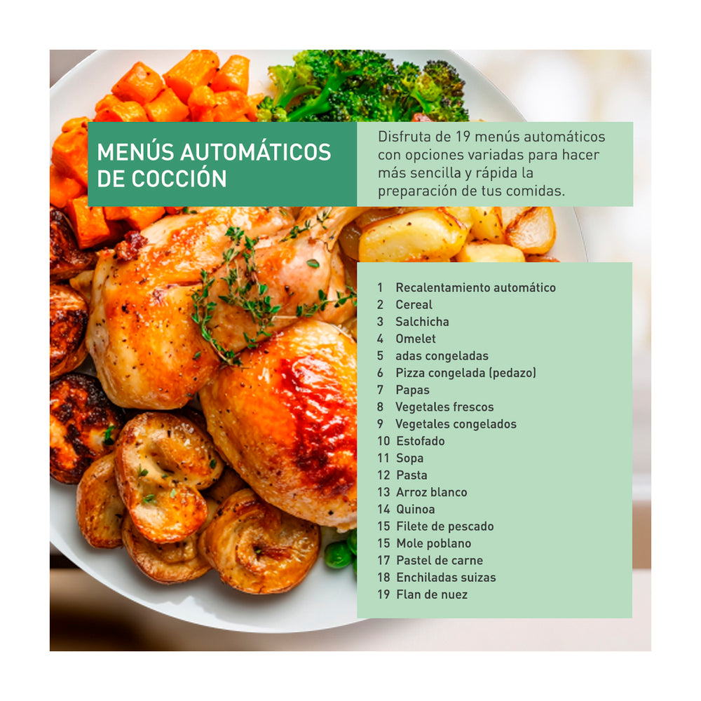 Simplemente seleccione la opción que desea utilizar y el microondas establecerá automáticamente los ajustes de tiempo y potencia requeridos: todo lo que necesita hacer es presionar "iniciar".