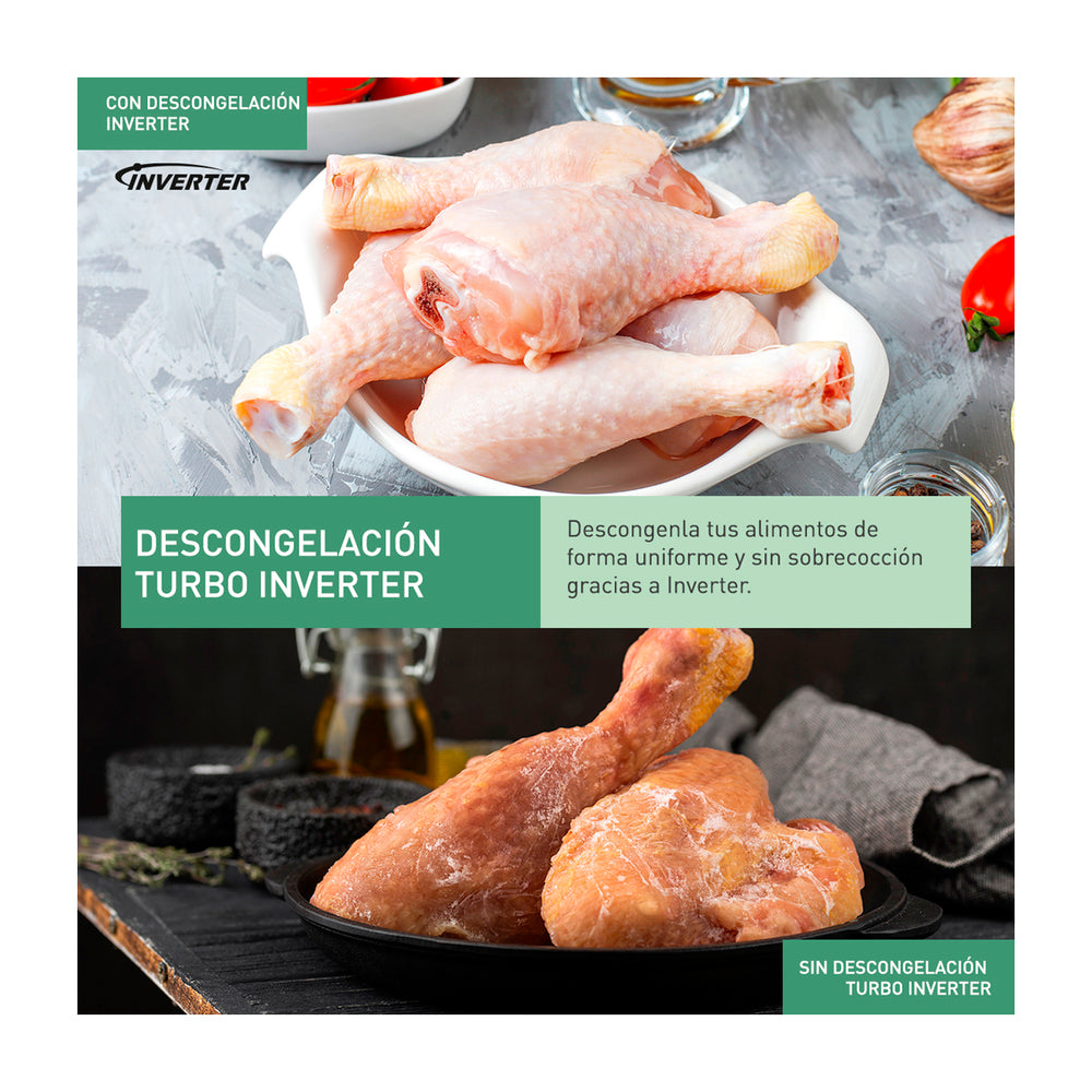 La función Turbo Defrost utiliza un sistema de secuenciación de microondas basado en el método de suministro continuo de potencia del Inverter para lograr una distribución uniforme del calor. Esto reduce eficazmente el tiempo de descongelación, una gran ventaja para cocinar entre semana.