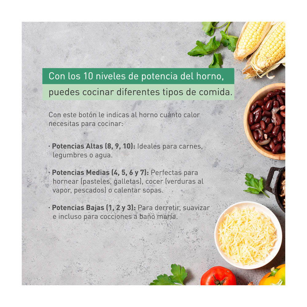 Función de Auto Descongelar – solo debes ingresar los alimentos al horno, presionar el botón y agregar el peso.