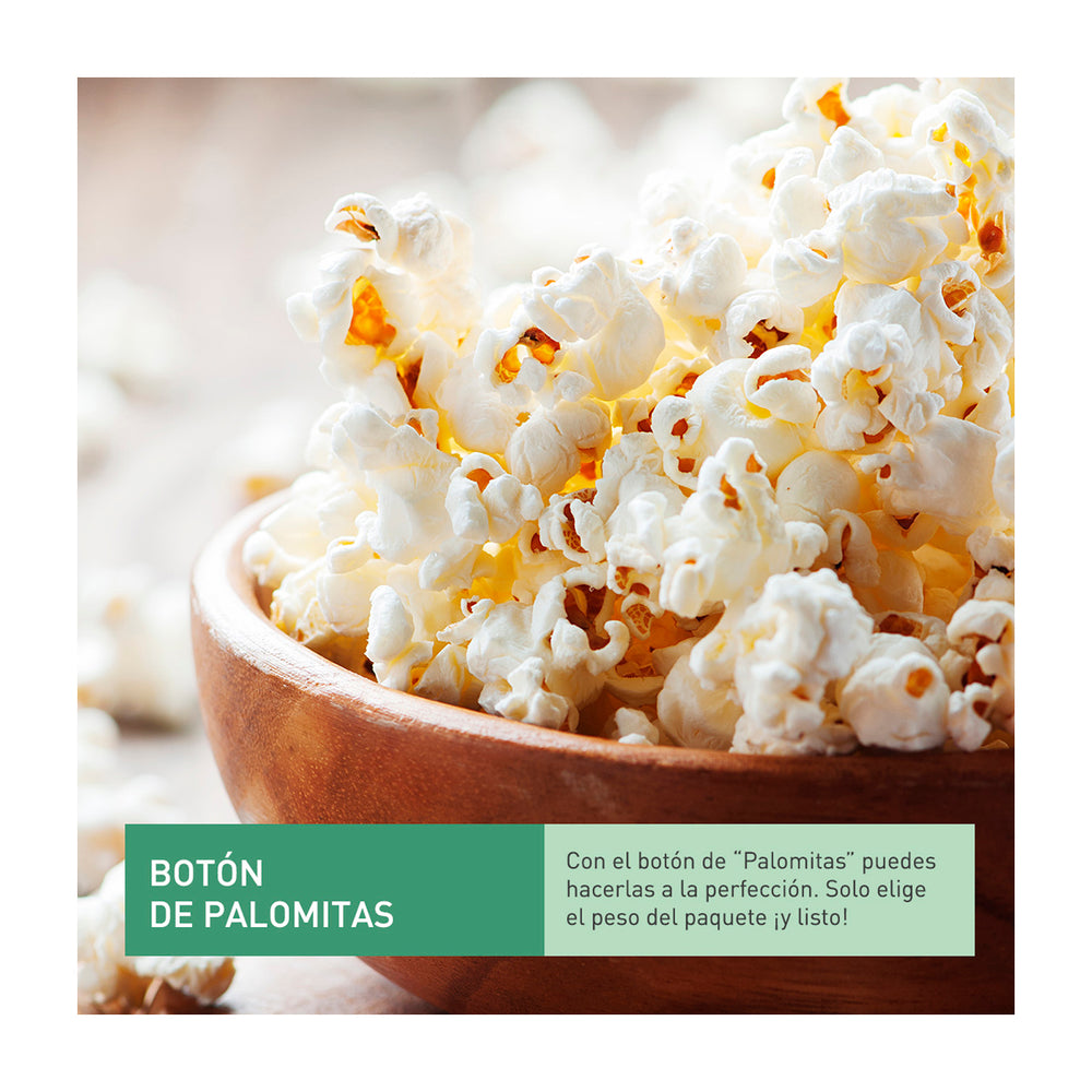 Con el botón “Palomitas” puedes hacerlas a la perfección de acuerdo al peso (en gramos) del paquete.