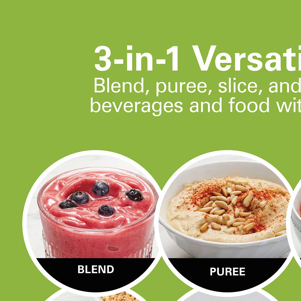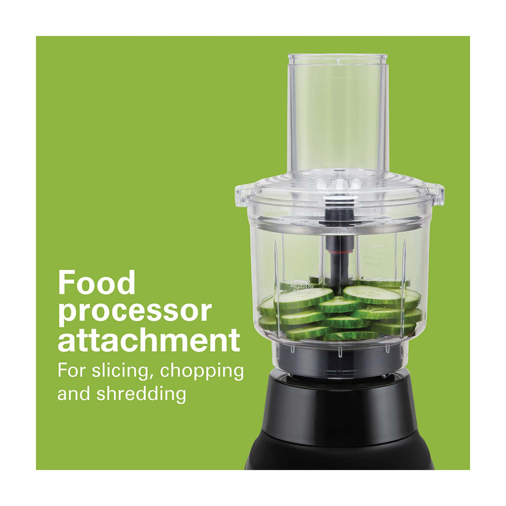Hamilton Beach® MultiBlend® hace el trabajo de 3 electrodomésticos separados: una licuadora de cocina tradicional, un procesador de alimentos y una licuadora personal. Tiene un potente motor con 800 vatios de potencia máxima que tritura hielo, mezcla, pica, rebana, tritura y más. Un solo sistema de cuchillas MultiBlend maneja todas sus necesidades de licuado y procesamiento de alimentos. Solo elija el accesorio correcto: la jarra de vidrio MultiBlend de 52 oz, la jarra personal de 20 oz para batidos y licuados de una sola porción, o el accesorio procesador de alimentos con un disco para rebanar y triturar incluido. Use la jarra de vidrio de 52 oz con pico vertedor antigoteo para hacer una tanda de batidos o para hacer puré de salsa de pasta fresca.
