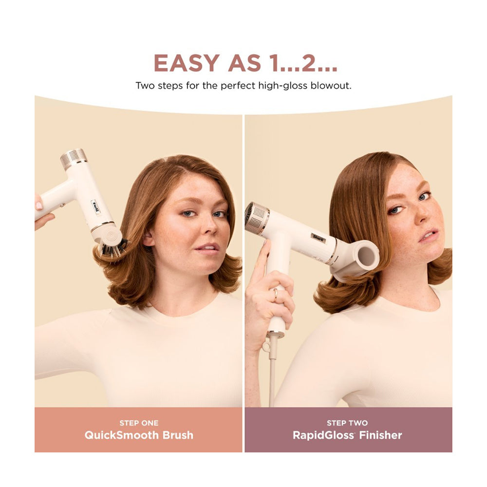 Coloca el RapidGloss Finisher para lograr un acabado de alto brillo en el cabello seco y liso. Dos corrientes de aire de alta velocidad trabajan juntas para recoger y alisar los cabellos sueltos sin encresparlos*. *en comparación con el secado al aire, según una encuesta a 600 personas.