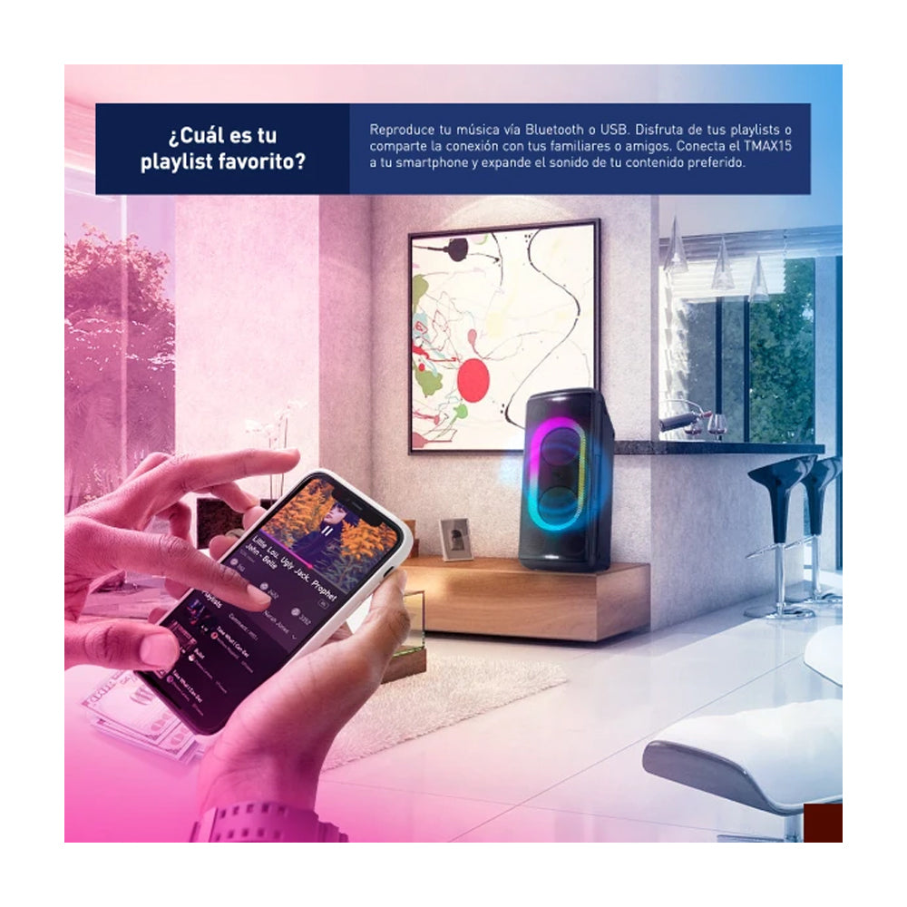 TMAX15 es un sistema de audio de alta potencia diseñado con estilo para la vida moderna, que ofrece un sonido potente y de calidad. Aporta un nuevo nivel de emoción a las reuniones como nunca antes, haciéndolas más agradables y memorables.