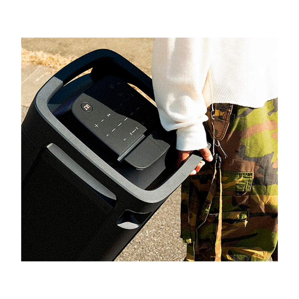 El cómodo agarre de transporte y las ruedas estables facilitan el transporte del parlante. Un panel superior resistente a salpicaduras es ideal para un uso sin preocupaciones en fiestas propensas a derrames.