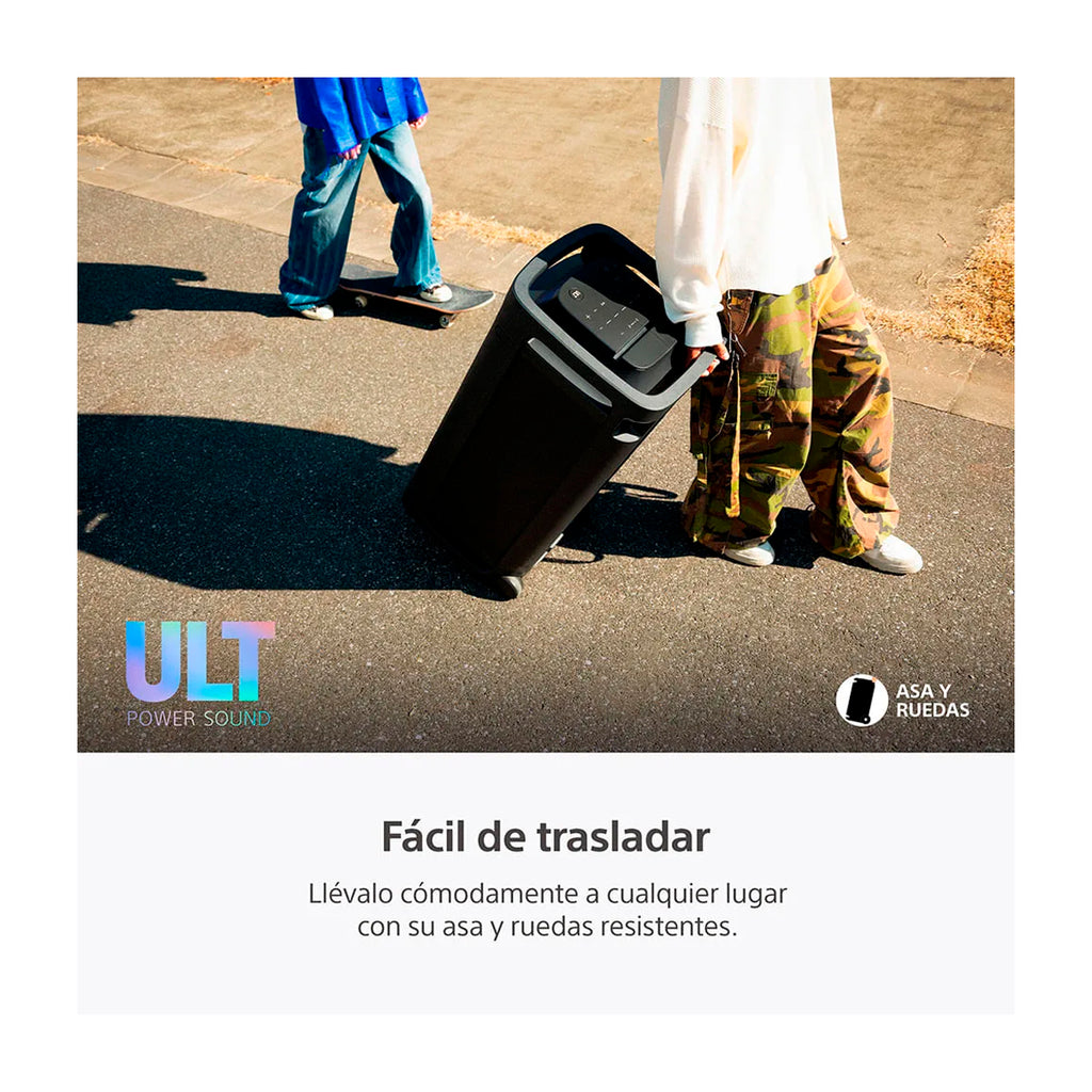 Un agarre fácil de transportar hace que sea sencillo transportar o levantar tu parlante, y las ruedas estables significan que puedes arrastrarlo por largas distancias