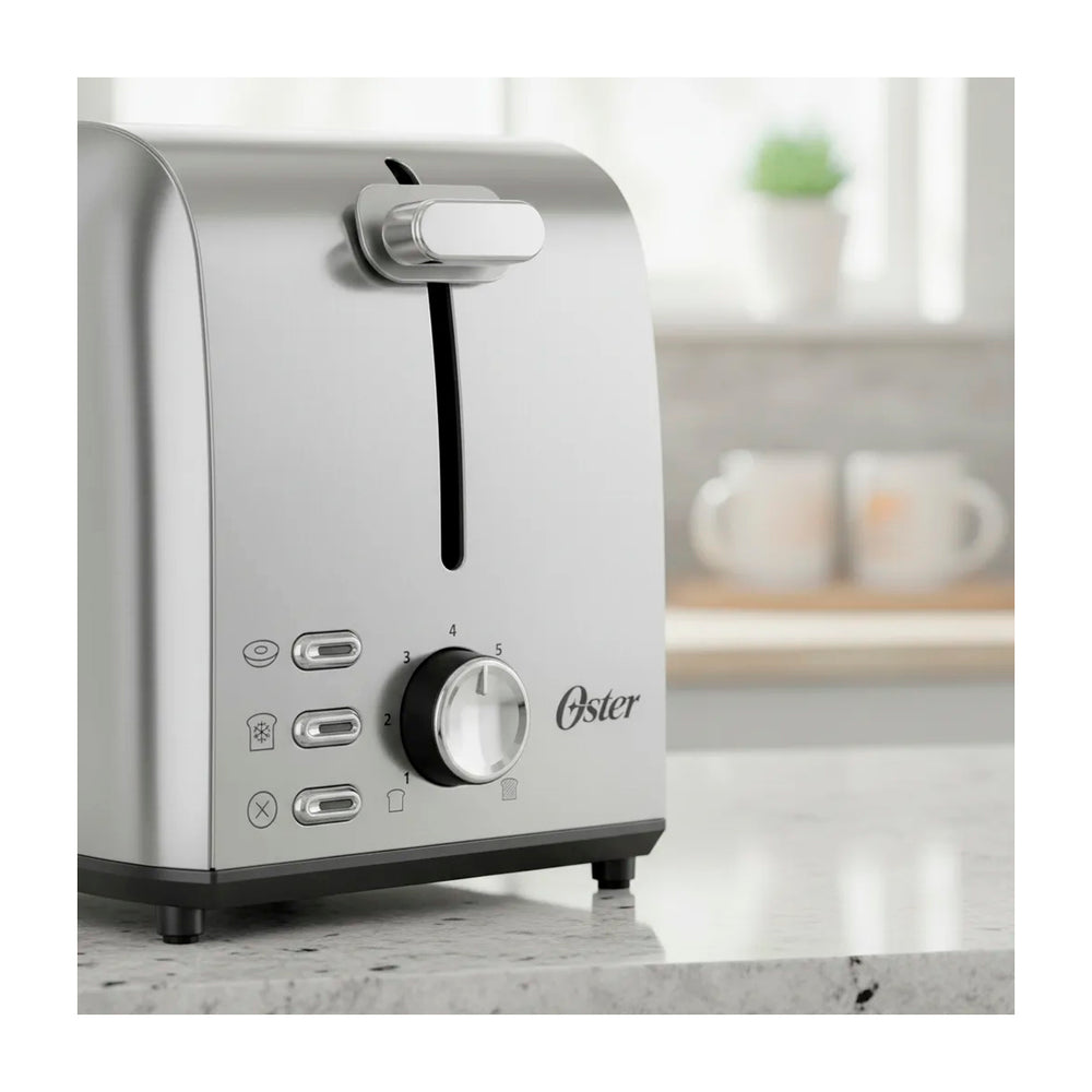 Oster OTST00MNSS2SGB24 Tostadora de 2 Rebanadas | 7 Niveles de Tostado | Ranuras Anchas | Acero