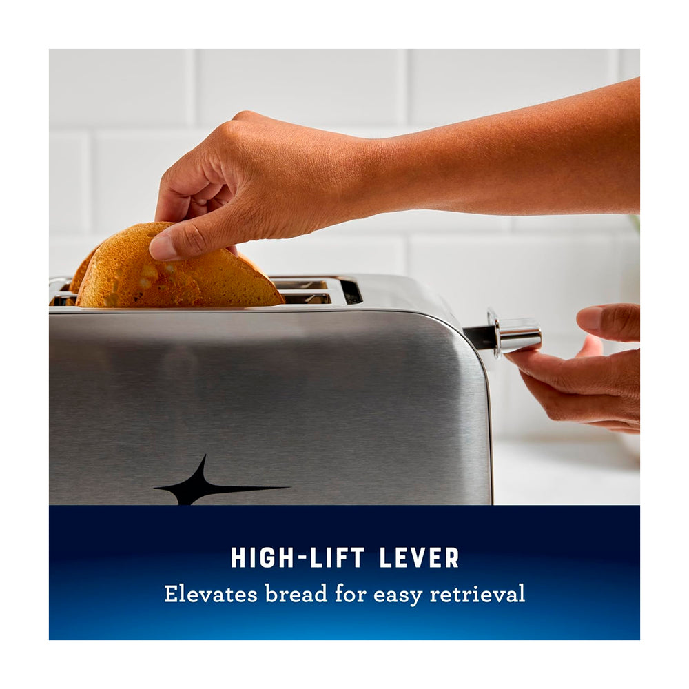 La palanca de elevación alta eleva el pan para una fácil recuperación, mientras que la bandeja extraíble para migas facilita la limpieza.