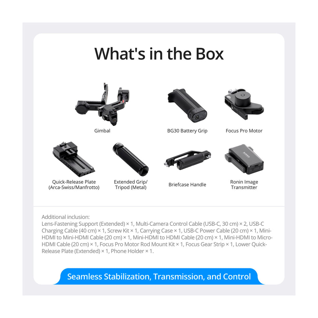 Ajuste remotamente la exposición de la cámara directamente en la app Ronin o controle el estabilizador con el joystick virtual para disfrutar de una experiencia de monitoreo y control integrada. Con el Transmisor de Imagen Ronin, puede usar un teléfono inteligente como controlador de movimiento para controlar remotamente el estabilizador RS 4 Pro y lograr movimientos de cámara más flexibles y dinámicos.