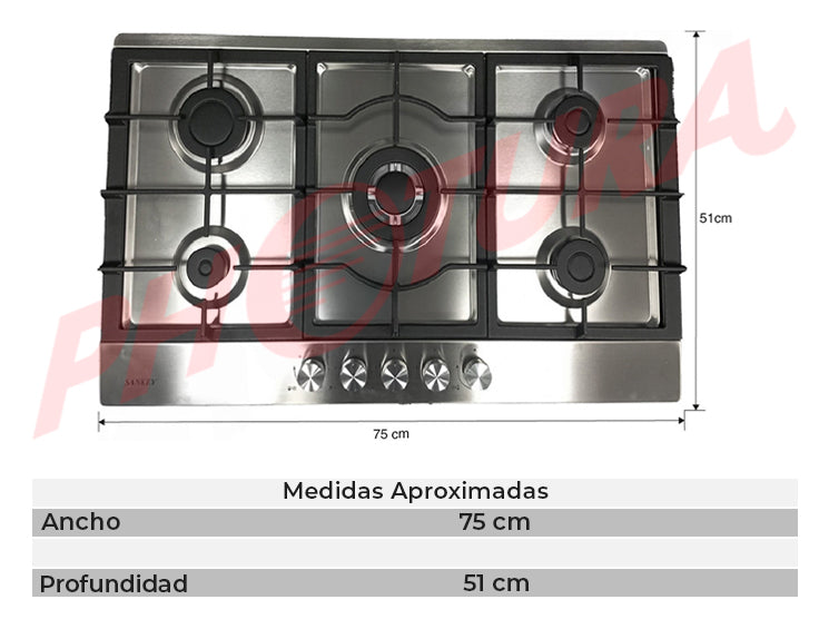 Sankey Estufa Empotrable a Gas de Acero Inoxidable | 75cm | 5 Quemadores | Encendido por Pulso